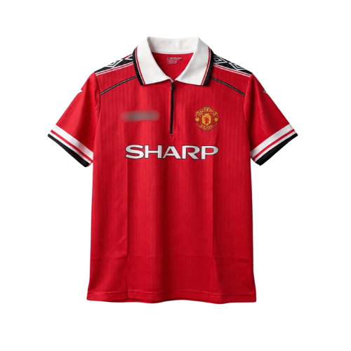 The shirt is iconic red with a white zip polo collar and black/white trim on the shoulders and sleeve cuffs. the Manchester United crest on the left chest, and the SHARP sponsor across the front.